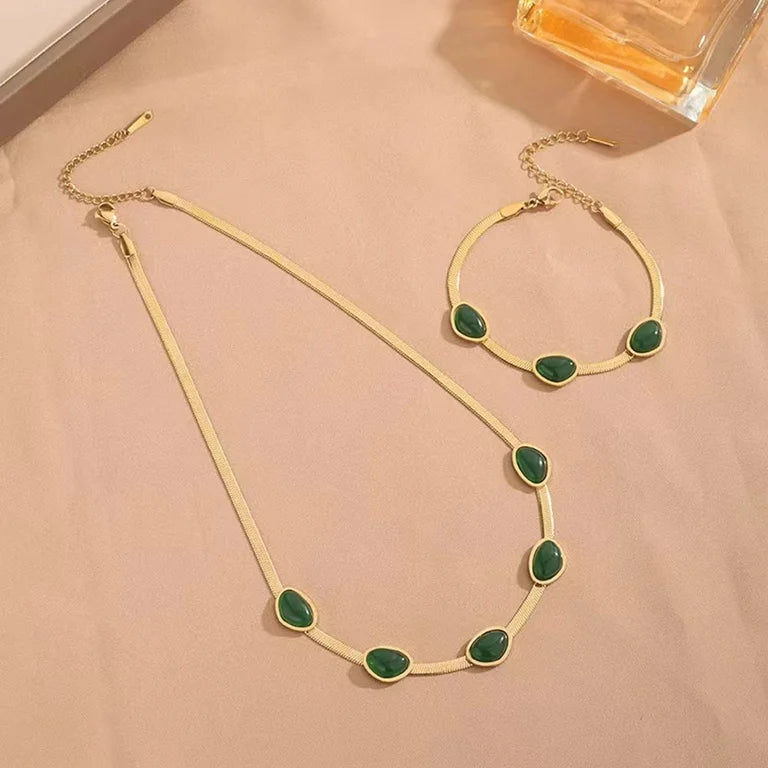 Elevate your style with the Green Stone Snake Set. 🖤✨ This striking set features bold black stones paired with a sleek snake chain, including earrings, and a necklace. Perfect for making a statement, this set adds a touch of modern elegance to any outfit.