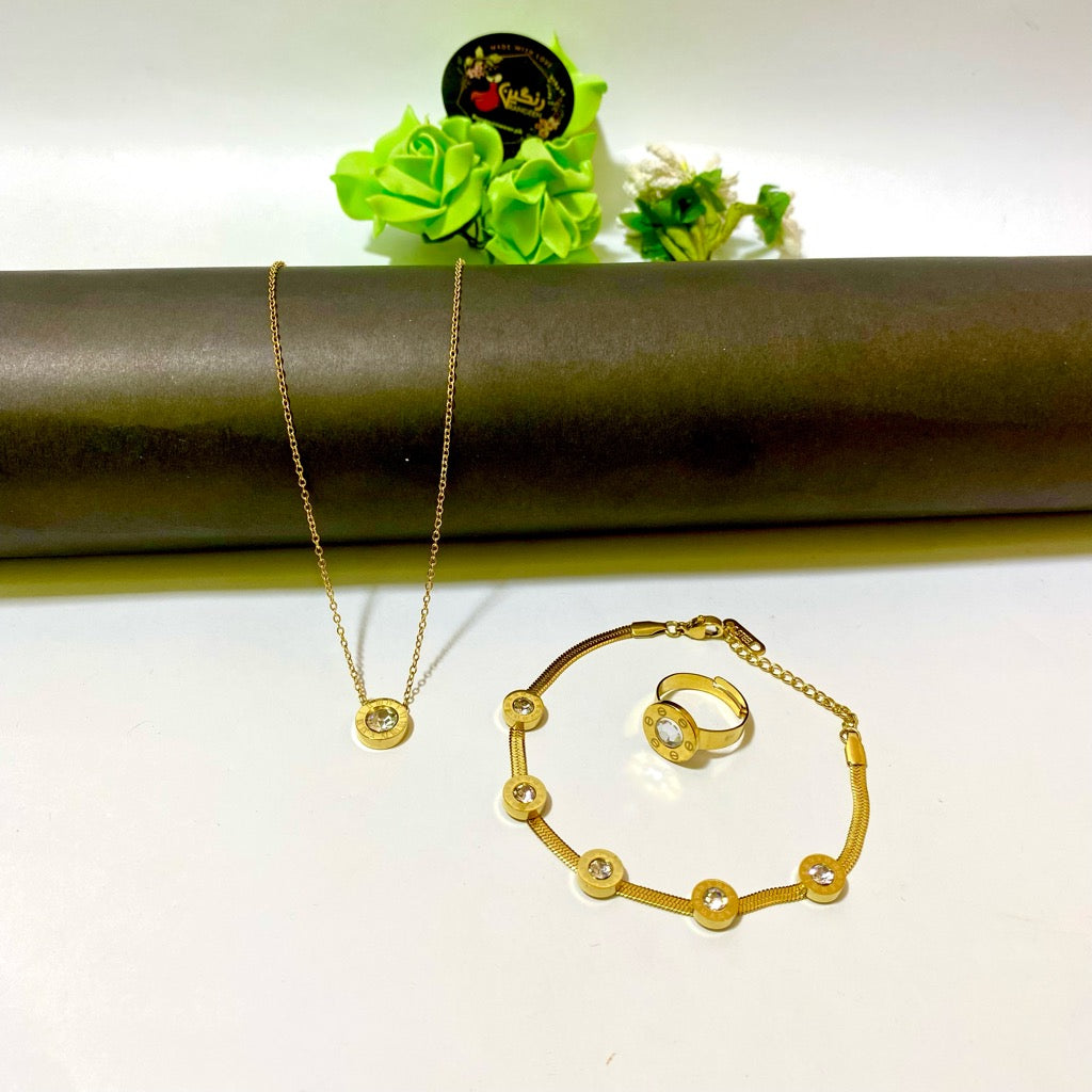 Elevate your elegance with this stunning jewelry set, featuring a matching necklace and ring adorned with sparkling zircon diamonds. Designed to shine with every movement, this set is the perfect blend of sophistication and modern style. The zircon stones offer a high-quality, diamond-like brilliance that catches the light beautifully, ensuring you stand out in any crowd. Both the necklace and ring are crafted with precision, ensuring durability and comfort. Tarnish-free and waterproof, this set is ideal for daily wear or special occasions.