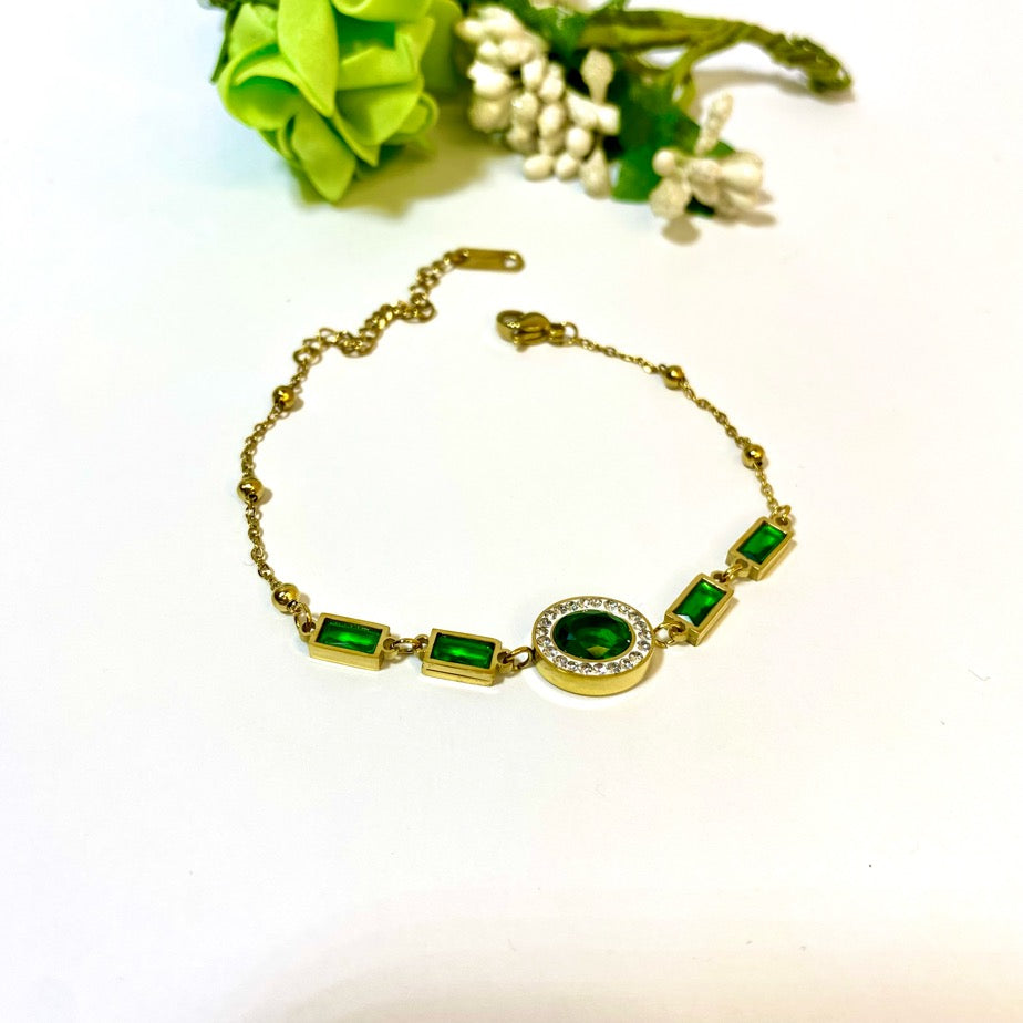This stunning bracelet features five beautifully cut green zircon stones, each set with precision to catch the light with every move. The rich green hue brings a touch of nature-inspired sophistication, perfect for both everyday elegance and special occasions.